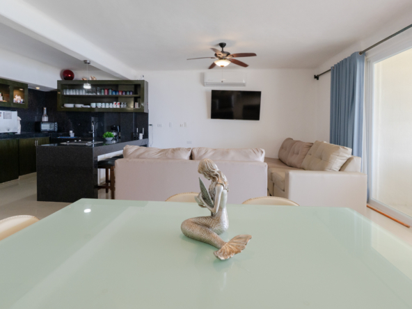 With 2 spacious bedrooms and 2 full bathrooms, this fully furnished apartment provides everything you need for immediate enjoyment. The open-plan design connects the living area with a private terrace, where you can relax, dine outdoors, or walk directly to the pool area. From here, you’ll enjoy stunning views of the sea and the lush tropical surroundings.
