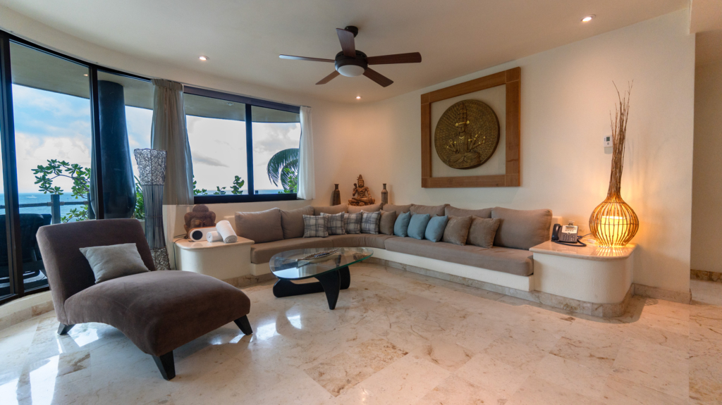 This spacious three-bedroom oceanfront residence offers expansive private terraces and unobstructed views of the Caribbean Sea. The living room features curved panoramic windows that frame the ocean, creating a seamless connection between indoor comfort and the natural beauty of the coastline.